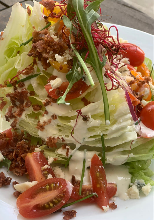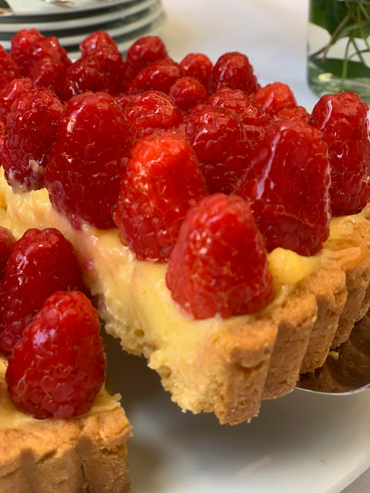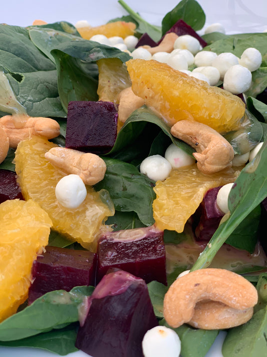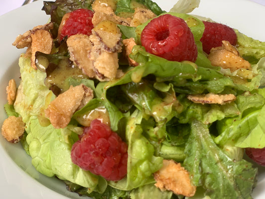 Mezcla de lechugas con almendra caramelizada y frambuesa
